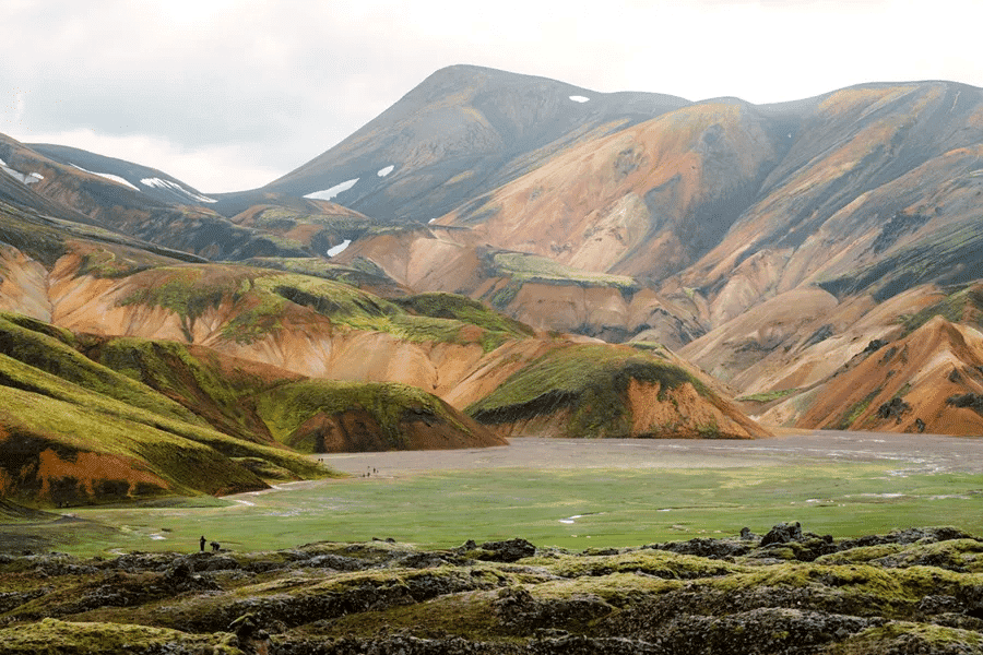 The starting location for the Laugavegur trek is Landmannalaugar. We’ll hike through Vondugil Canyon and Laugahraun Lava Field, whose barren features perfectly contrast the beautifully colorful rhyolite mountains and volcanoes like Brennisteinsalda. If the time allows, we’ll visit the Graenagil Gorge and Bláhnjúkur Volcano.