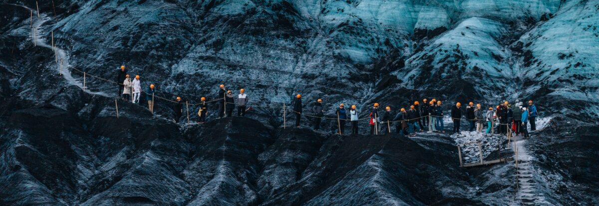 On this Katla Ice cave tour – Meet at Vík, we will come to a stop near the roots of Kötlujökull glacier, and the view that greets us is otherworldly. We will put on our crampons and helmets, and take a short walk to the opening of the ice cave. We might need to climb a few steps on ladders to the entrance of the cave. As the natural ice cave is in constant change, conditions can be different at each tour. The climb is, however, not difficult at all, and anyone in an average physical condition should be able to climb these steps. It might look adventurous, but it is not demanding at all!