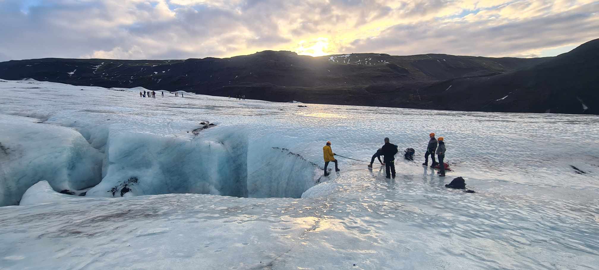 After a short but very important demonstration on how to properly use the glacier equipment we head up the riddled outlet glacier; walking between deep crevasses, amazing ice formations, jagged ridges, and spine-tingling sinkholes.