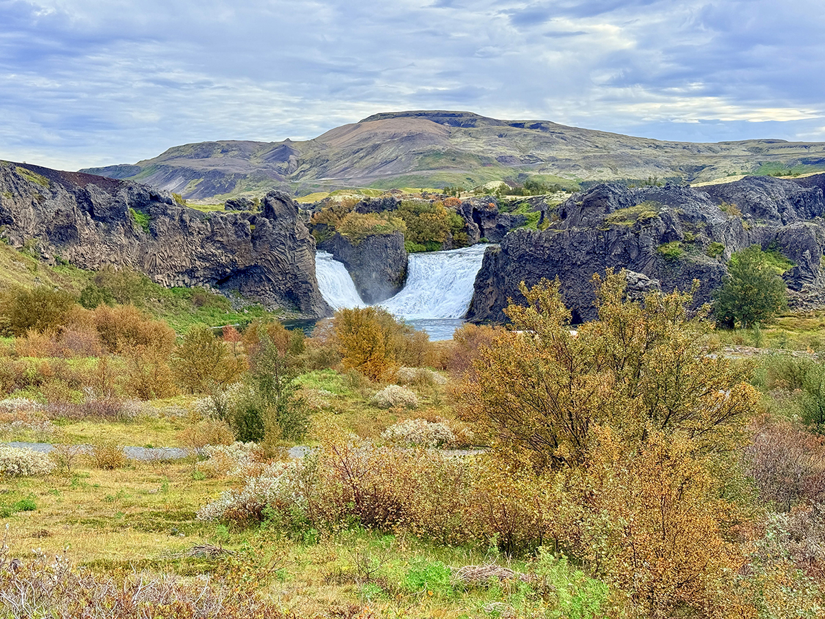 One of Iceland’s most unique waterfalls, Hjálparfoss features two streams that cascade symmetrically into a calm pool. Surrounded by striking basalt formations, the waterfall creates a beautifully balanced natural setting. As a result, it is one of the most photographed waterfalls in the Þjórsárdalur valley.